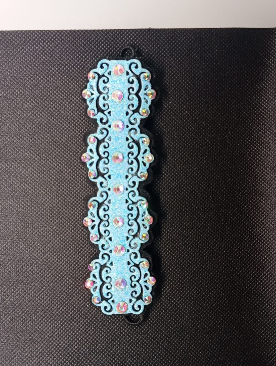 Tocado para moño de gimnasia rítmica, patinaje, baile deportivo… con alambre trasero para dar forma y gomas para enganchar con horquillas.