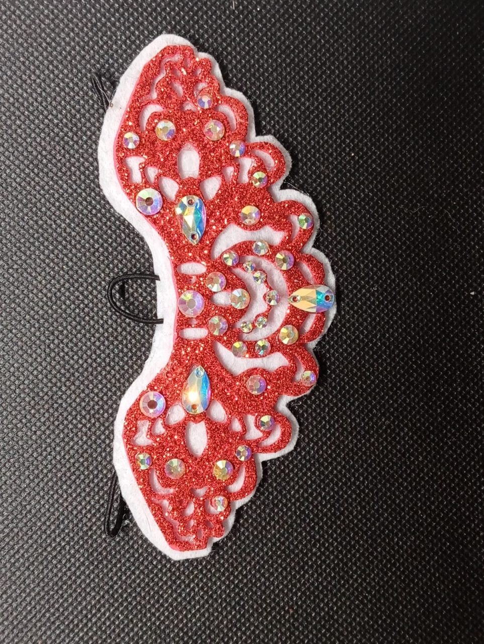 Tocado para moño de gimnasia rítmica, patinaje, baile deportivo… con alambre trasero para dar forma y gomas para enganchar con horquillas.