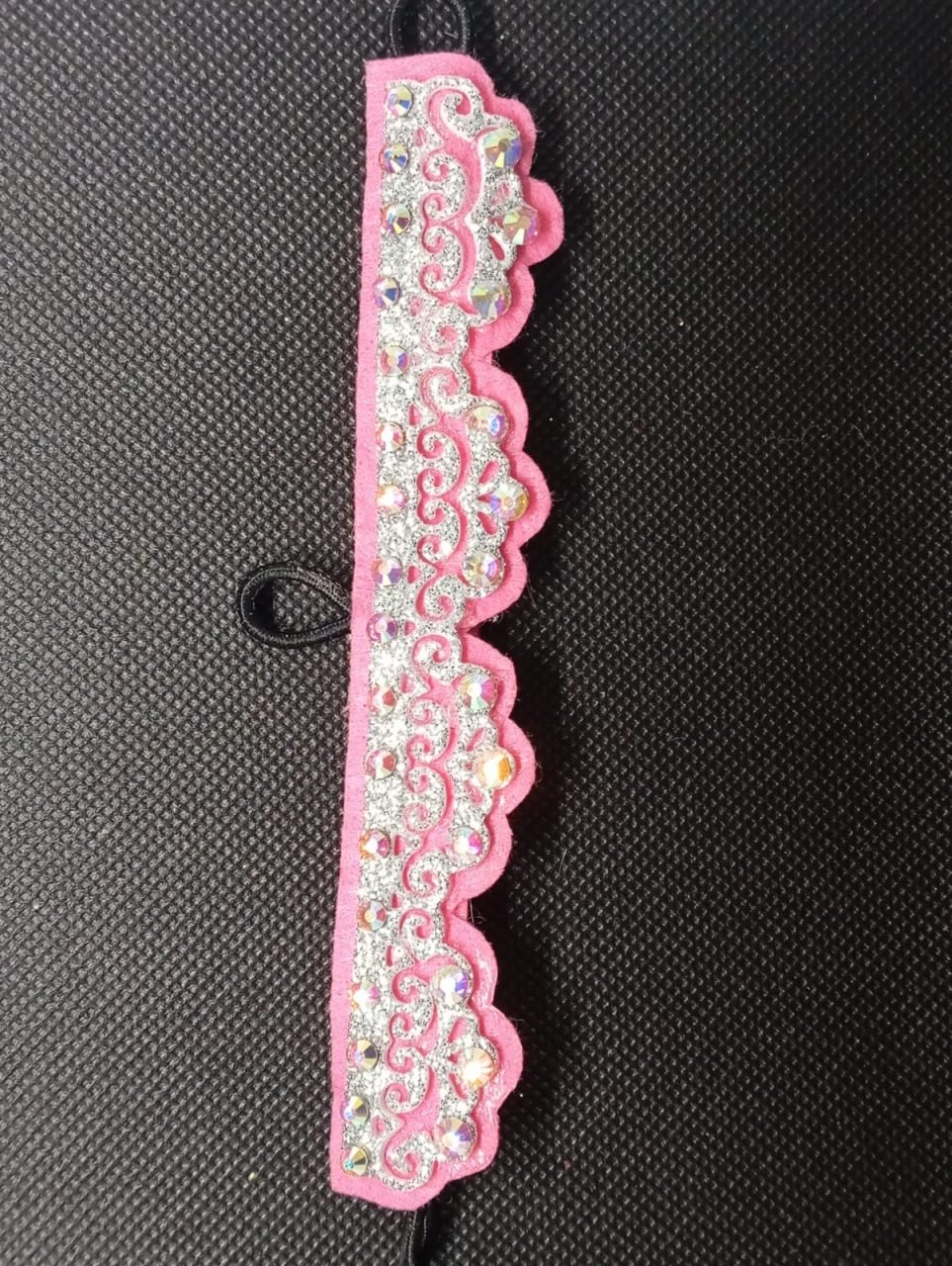 Tocado para moño de gimnasia rítmica, patinaje, baile deportivo… con alambre trasero para dar forma y gomas para enganchar con horquillas.
