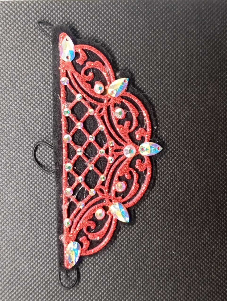 Tocado para moño de gimnasia rítmica, patinaje, baile deportivo… con alambre trasero para dar forma y gomas para enganchar con horquillas.