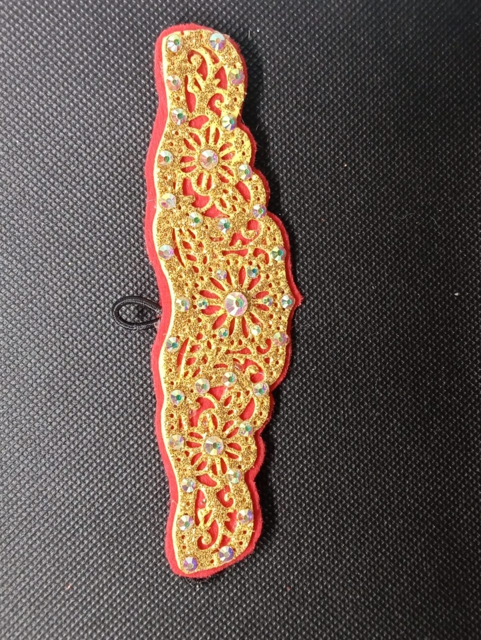 Tocado para moño de gimnasia rítmica, patinaje, baile deportivo… con alambre trasero para dar forma y gomas para enganchar con horquillas.
